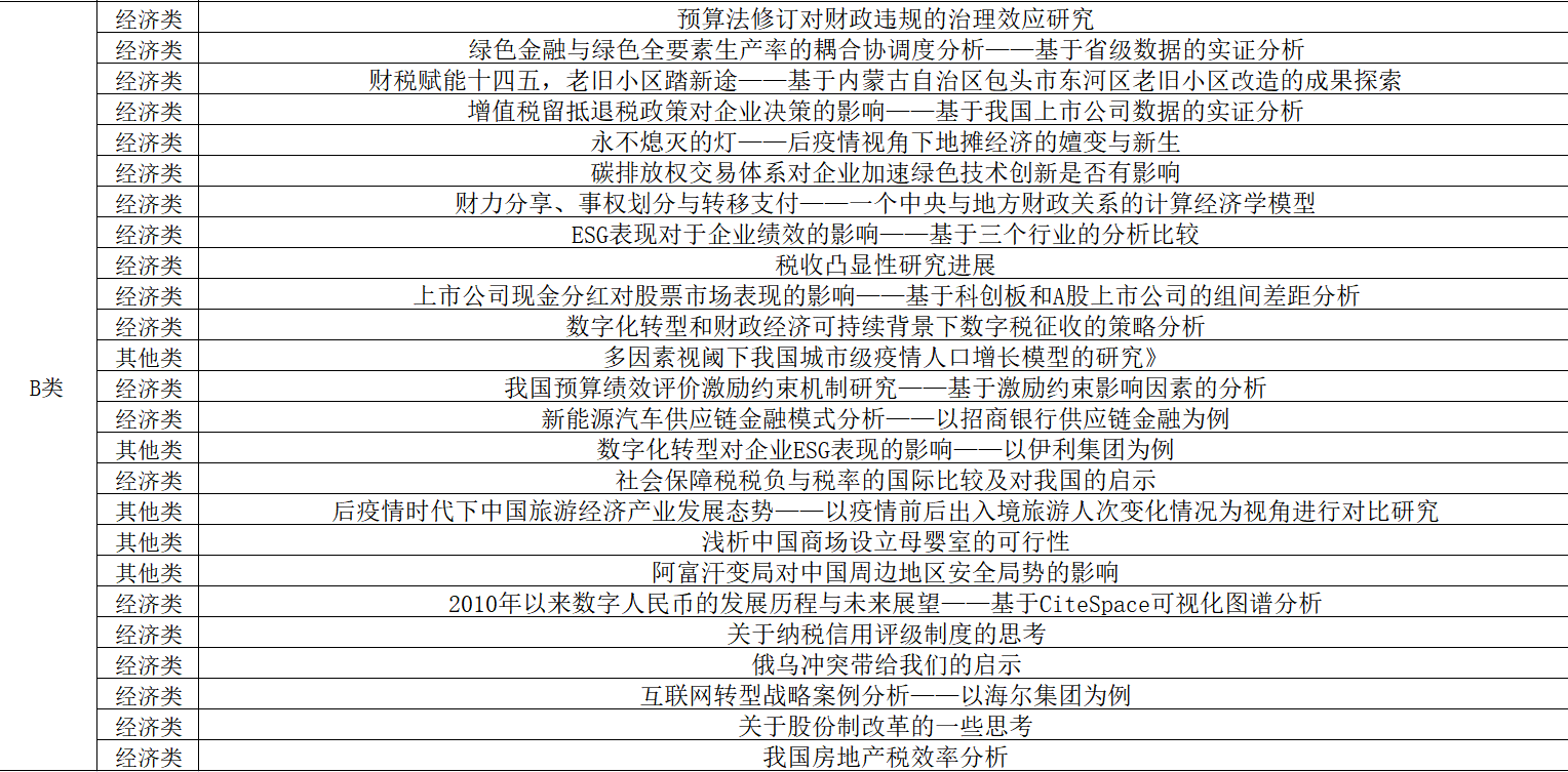 公司3位专业老师组成评审小组,依据大赛评分标准对参赛作品进行严格审核和公正评判。按照A类作品数量不超过作品总数40%的标准,根据评审分数排序,最终评选出A类作品16篇(经济类13篇,管理类1篇,其他类2篇),B类作品25篇(经济类20篇,其他类5篇),现将评审结果公示如下: