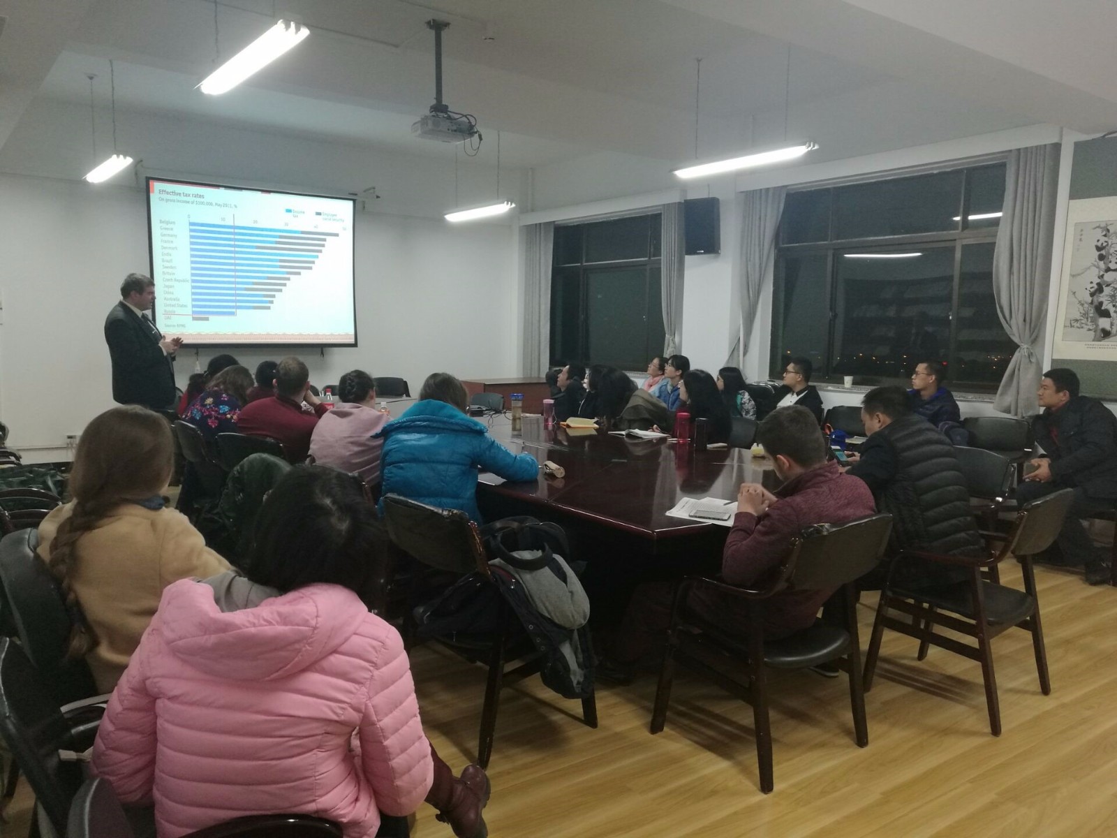 Alexander教授详细介绍了自上世纪90年代以来俄罗斯的税制改革历程,历经了四个阶段,深入改革复杂、低效的税收制度,形成了具有国际竞争力的现代税制。俄罗斯于1992年开启新的税制改革,积极借鉴了发达国家的税制设计,同时兼具俄罗斯自身的税制特色。Alexander教授还详细介绍了当前俄罗斯税收法律体系、税收部门架构、税制结构、不同层级政府的税收收入规模、税收的宏观经济效应、未来税制改革方案等问题,立体呈现出税收制度在当前俄罗斯经济社会中的重要地位。听完Alexander教授的介绍与政策分析,师生积极与Alexander教授讨论了未来俄罗斯税制改革的一些具体议案,比如将目前个人所得税13%的比例税率形式改为累进税率,更加重视税收的组织收入功能,以税收刺激经济复苏等,讲座与交流整整持续了近3个小时。