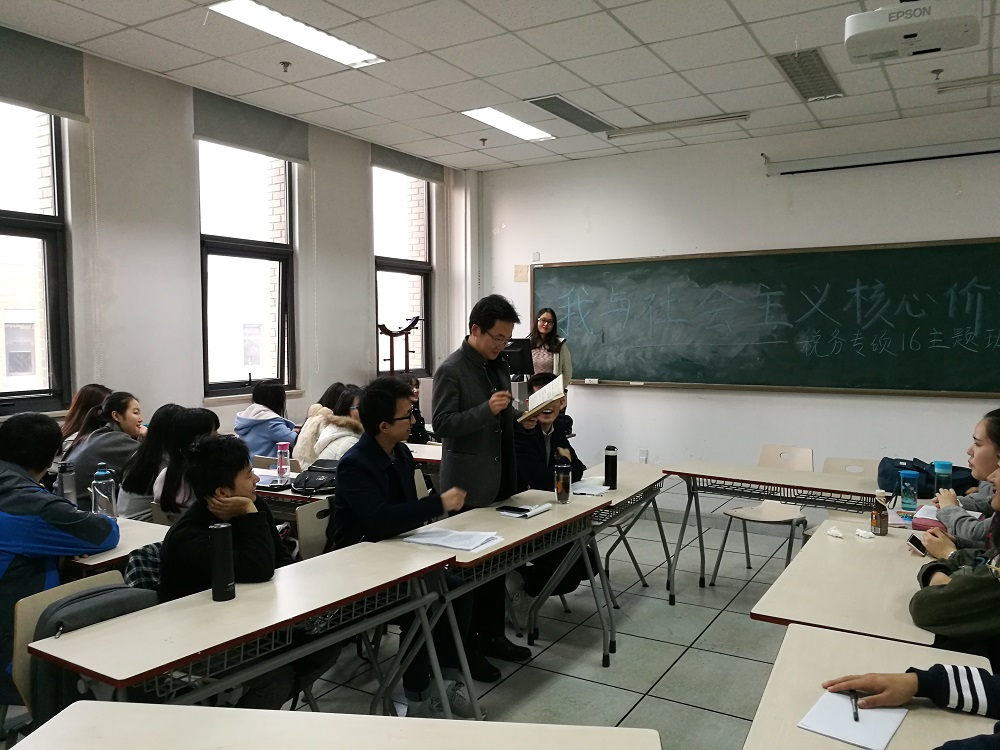 社会主义核心价值观是社会主义价值体系中最基础、最核心的价值观念,是社会主义社会科学发展的价值导向,是马克思主义指导思想和中国特色社会主义共同理想的价值内核,是对以爱国主义为核心的民族精神、以改革创新为核心的时代精神和社会主义荣辱观的价值升华和高度概括。社会主义核心价值观对在校员工的思想和行为起到确定方向、规范引导的作用。鉴于社会主义核心价值观的重要性,2016级税务硕士班委们在辅导员老师的指导下,在1122日组织了一场以“我与社会主义核心价值观”为主题的班会。