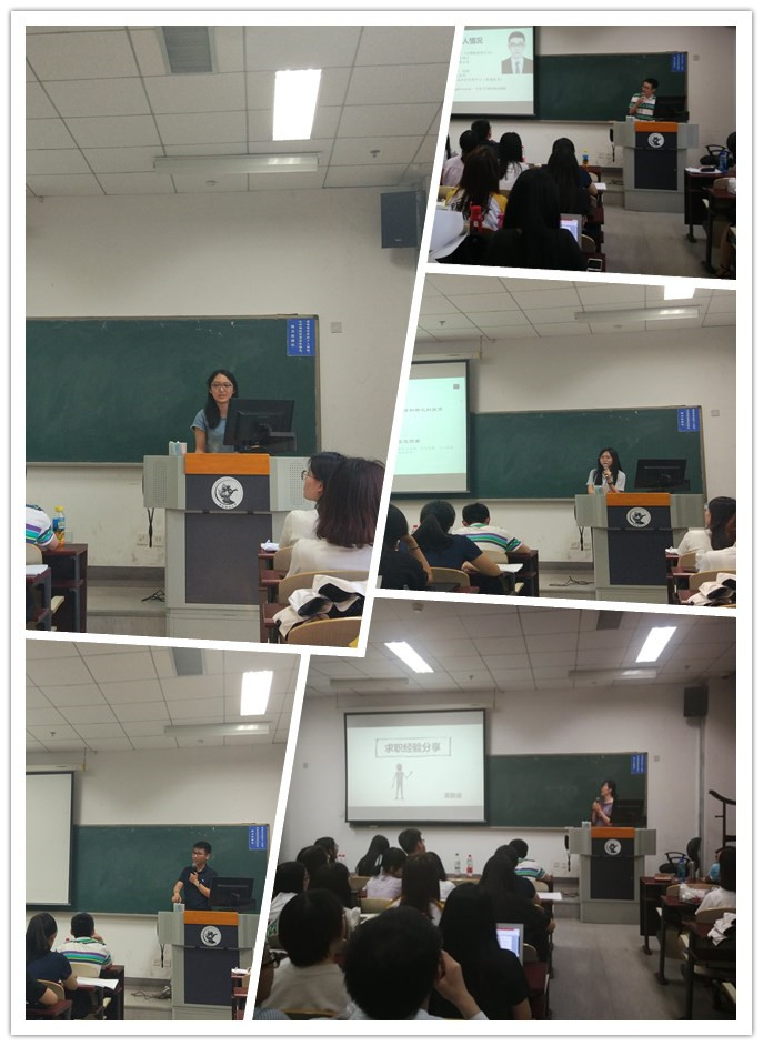 王雁翔同学分享了参加选调生选拔的经验,建议同学们要多关注不同省份选调生的招聘消息,有针对性进行准备。郑植同学主要分享了寻找暑期实习的经验,他建议同学们要注意思考公司有没有留用机会和自己想不想在这份实习中留用这两个问题以便尽早决定自己的求职目标。王程祥同学为学弟学妹们介绍了不同行业的优秀公司,为同学们投递不同公司和岗位开阔了思路。高皓洁同学分享了她考取公务员的经验,为同学们找工作、考公务员、考注册会计师等证书的协调做出了建议。黄静涵同学按照求职流程做了详细的经验分享,给出了很多小tips,建议同学们求职过程中要保持良好的心态