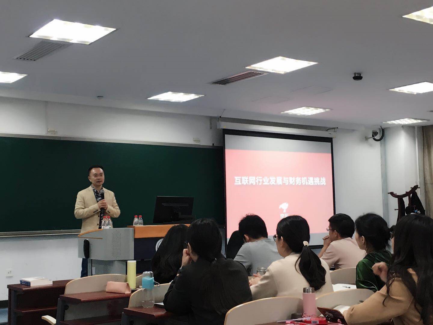 随后,蔡老师为我们介绍了京东集团区块链增值税专用发票电子化的成果,蔡磊老师作为京东增值税电子发票的推动者,不仅在业务范围不断积极探索,做大做强,也努力在财务方面进行优化,达到节省成本、提升效率和增值应用的效果,蔡老师用流程图向同学们介绍了京东发票系统、大象慧云服务器、京东融聚系统和金融企业如何通过区块链数据平台完成增值税电子发票的开具,将物联网和区块链的价值充分发挥出来。同时,蔡老师还介绍了京东集团创新实践的成果,分析今后的财税方向必是朝着智能化发展,鼓励同学们好好充实自我,抓住时代机遇。