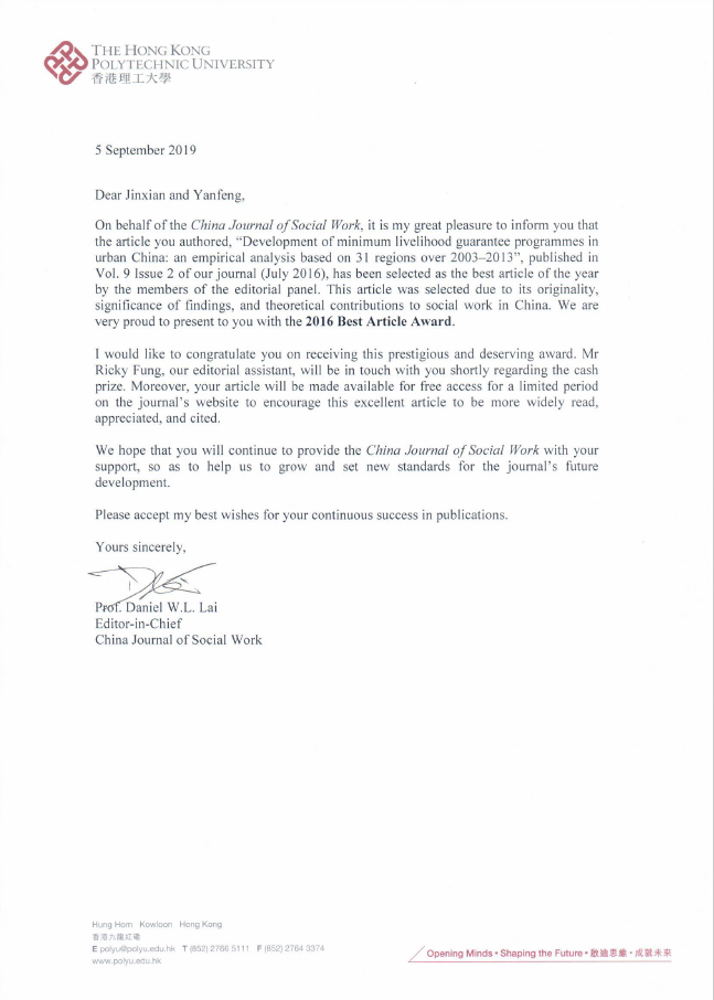 近日,永利集团官网总站硕士毕业生汪进贤同学和白彦锋教授合作撰写的英文文章《中国城市最低社会保障制度的发展:基于31个省区市实证研究的分析》(Development of minimum livelihood guarantee programmes in urban China: an empirical analysis based on 31 regions over 2003–2013)获得香港理工大学《中国社会工作杂志》(China Journal of Social Work, CJSW)“2016年度最佳论文奖”(2016 Best Article Award)。该文最初发表于该杂志2016年7月。编辑部的贺信中对论文的创新性、研究发现的重要性以及对中国相关领域问题的贡献给予了高度评价。