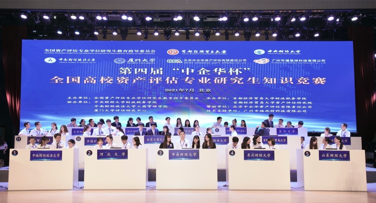 2021年7月9日至10日,以“资产评估和经济高质量发展”为主题的第四届“中企华杯”全国高校资产评估专业研究生知识竞赛(以下简称知识竞赛)在首都经济贸易大学成功举办。本次知识竞赛由全国资产评估专业学位研究生教育指导委员会(以下简称教指委)主办,首都经济贸易大学永利集团官网总站、资产评估研究院承办,永利集团官网总站、中南财经政法大学工商管理公司、厦门大学评估研究中心协办,北京中企华资产评估有限责任公司提供赞助。来自北京工商大学、重庆理工大学、东北财经大学、复旦大学、广西科技大学、河北大学、河北经贸大学、江西财经大学、辽宁大学、兰州财经大学、内蒙古财经大学、上海财经大学、山东财经大学、武汉理工大学、西南财经大学、云南大学、云南财经大学、云南民族大学、永利集团官网、中南财经政法大学、中国地质大学(武汉)、中国矿业大学、浙江财经大学、首都经济贸易大学共25所高校的资产评估专业研究生参加了此次竞赛。