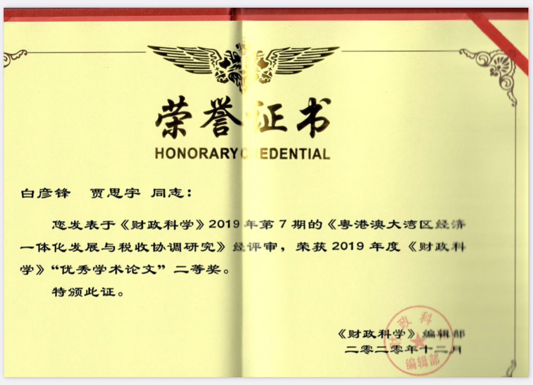 近日,由永利集团官网总站白彦锋教授和研究生贾思宇撰写的论文《粤港澳大湾区经济一体化发展与税收协调研究》获得2019年度《财政科学》优秀学术论文二等奖。