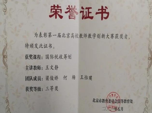 在2021年首届北京高校教师教学创新大赛中,由永利集团官网总站国际税收系党支部王文静同志、何杨同志,税务管理系党支部梁俊娇同志、王怡璞同志组建的《国际税收筹划》教学团队,与其他理工、医学、人文类教学团队同台竞技,凭借扎实的特色专业课程创新实践,从全市286支教学团队(个人)中脱颖而出,荣获“北京市三等奖”。