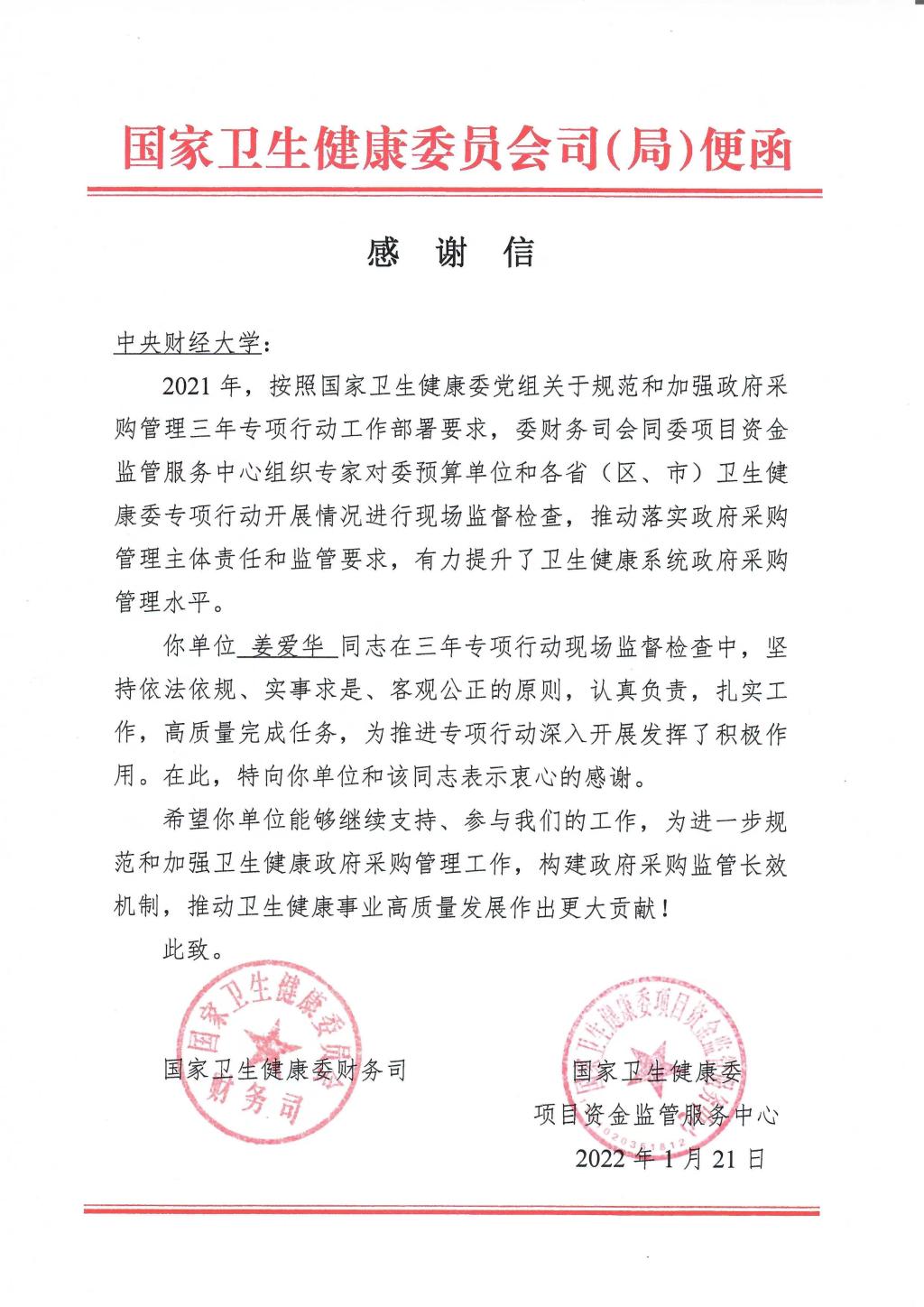 近日,国家卫生健康委员会财务司和项目资金监管服务中心向公司发来感谢信,对永利集团官网总站姜爱华教授团队积极参与国家卫生健康委政府采购三年专项行动工作表示感谢。