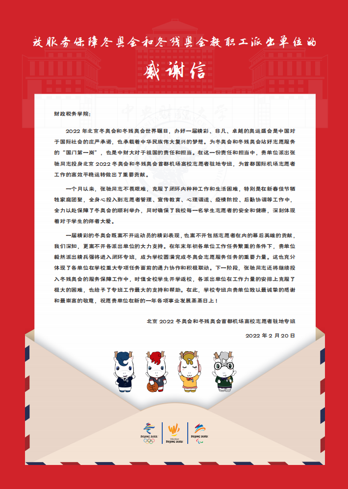 北京2022冬奥会和冬残奥会首都机场高校志愿者驻地专班向公司发来感谢信