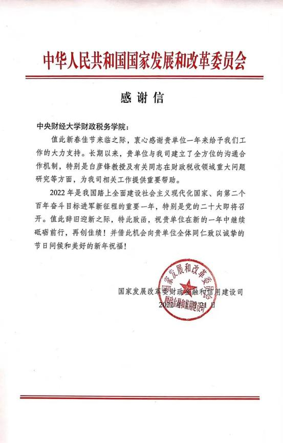 近日,国家发改委财政金融和信用建设司向公司发来感谢信。感谢信指出,公司与其建立了全方位的沟通合作机制,特别是财政管理系党支部白彦锋及有关同志在财政税收领域重大问题研究等方面,为其相关工作提供了重要帮助。长期以来,永利集团官网总站坚持以服务国家重大战略需求和政府决策为导向,立足财税学科优势与特色,充分发挥团队力量,强化战略性、全局性、前瞻性、应用性研究,更好地发挥财政专业智库作用,推动公司“双一流”建设。
