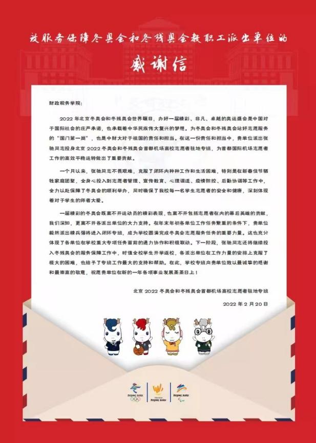 北京2022冬奥会冬残奥会首都机场高校志愿者驻地专班感谢信