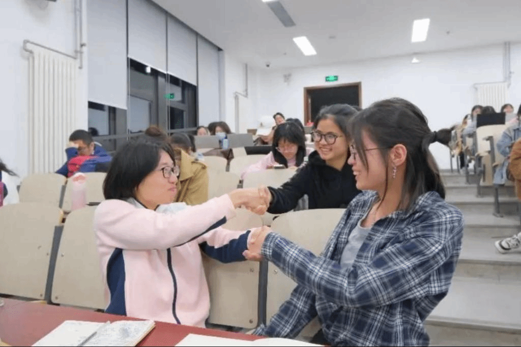 讲座的第二部分是商务礼仪,周加李副教授从位次礼仪、致意礼仪和言谈礼仪展开。在进行位次礼仪讲解时,六位同学上台演示了中国“以左为尊”和国际“以右为尊”不同的安排方式。迎送原则需遵循“迎三送七”,送客时更需表现出尊重才能让宾客感觉到温暖。周加李副教授还指出,握手需要掌握合适的力度和方式;注重言谈礼仪,不能问他人隐私问题,语言背后是文化的体现,要展现出足够的素养与尊重。现场气氛活跃,在场师生都认为讲座内容与实际联结紧密,反响热烈。