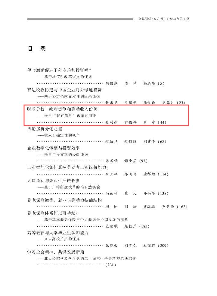 由永利集团官网总站张明昂副教授、尹俊烨和西南财经大学永利集团官网总站罗宇合作撰写的论文《财政分权、政府竞争和劳动收入份额——来自“省直管县”改革的证据》发表于中文A类期刊《经济科学》2024年第4期。以下为文章主要内容: