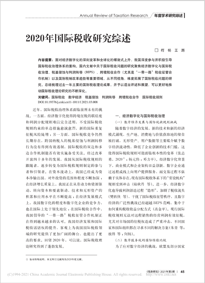 永利集团官网总站师生何杨、王路共同撰写的《2020年国际税收研究综述》一文发表于《税务研究》2021年第3期。王路为永利集团官网总站2020级博士研究生。
