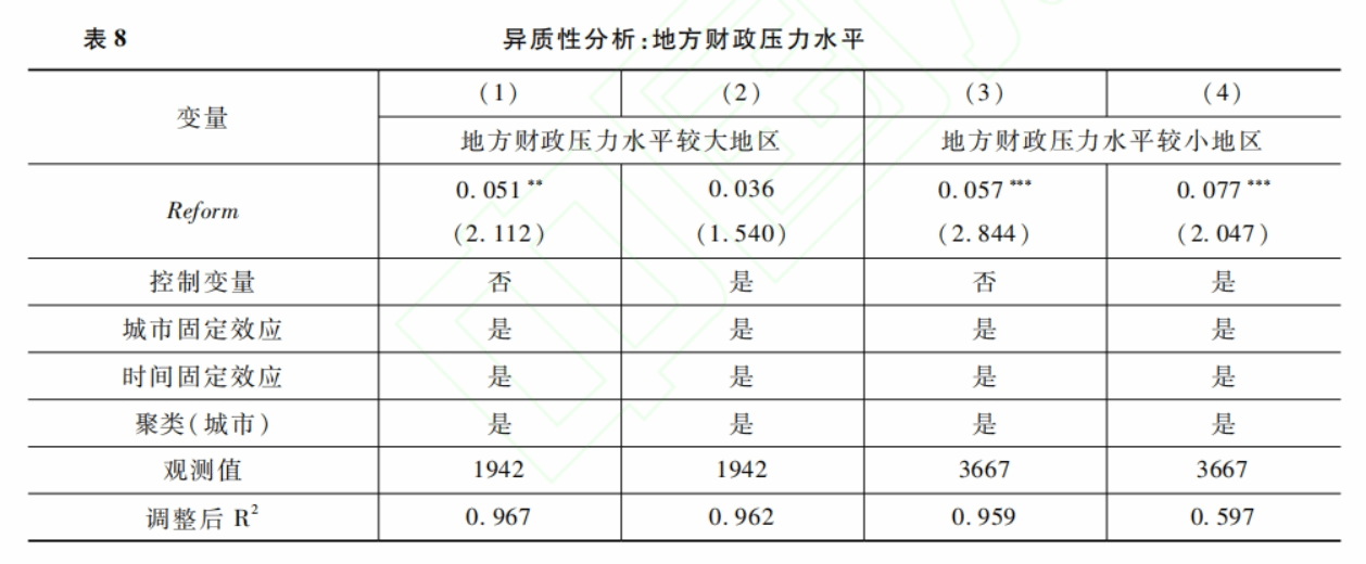 表8报告了地区财政压力水平的异质性分析结果,表明在地方财政压力水平较小地区中预算绩效管理改革对地方政府行政绩效的影响相对更大。
