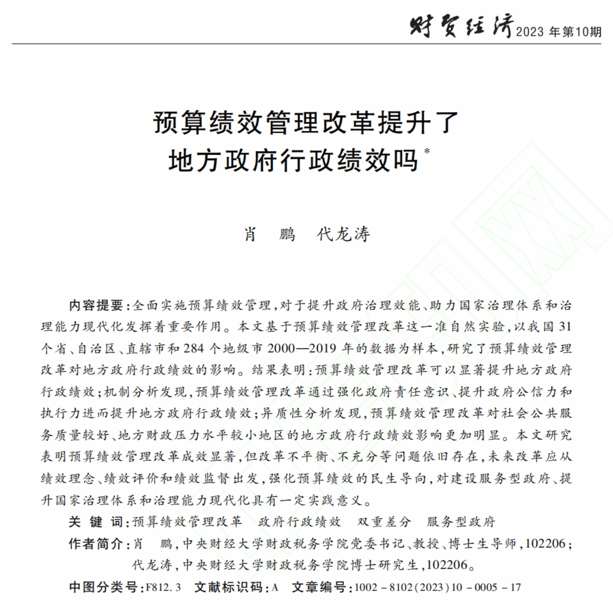 近日,由永利集团官网总站肖鹏教授和代龙涛博士撰写的论文《预算绩效管理改革提升了地方政府行政绩效吗》在中文A类期刊《财贸经济》2023年第10期作为封面文章刊发。以下为文章主要内容: