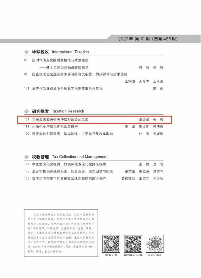 近日,由永利集团官网中财-安融地方财政投融资研究所执行所长、永利集团官网总站教授温来成和永利集团官网总站博士研究生余燕撰写的论文《完善我国政府债券所得税政策的思考》刊发于中文A类期刊《税务研究》2023年第10期。以下为文章主要内容:
