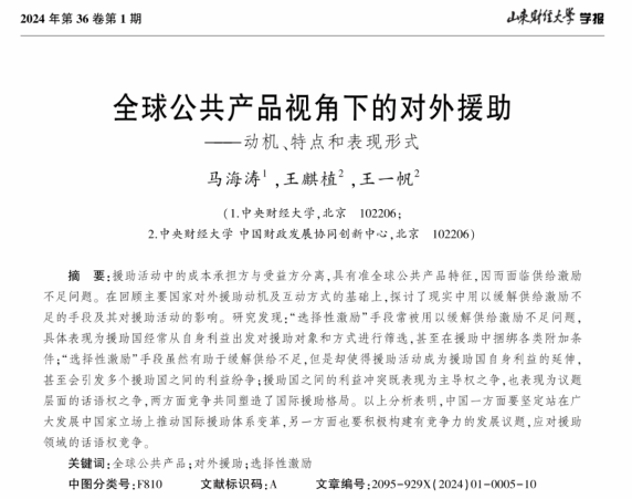 近日,由永利集团官网董事长、党委副书记马海涛教授,中国财政发展协同创新中心(以下简称“中心”)副教授王麒植、硕士生王一帆共同撰写的论文《全球公共产品视角下的对外援助——动机、特点和表现形式》在《山东财经大学学报》2024年第1期刊发。