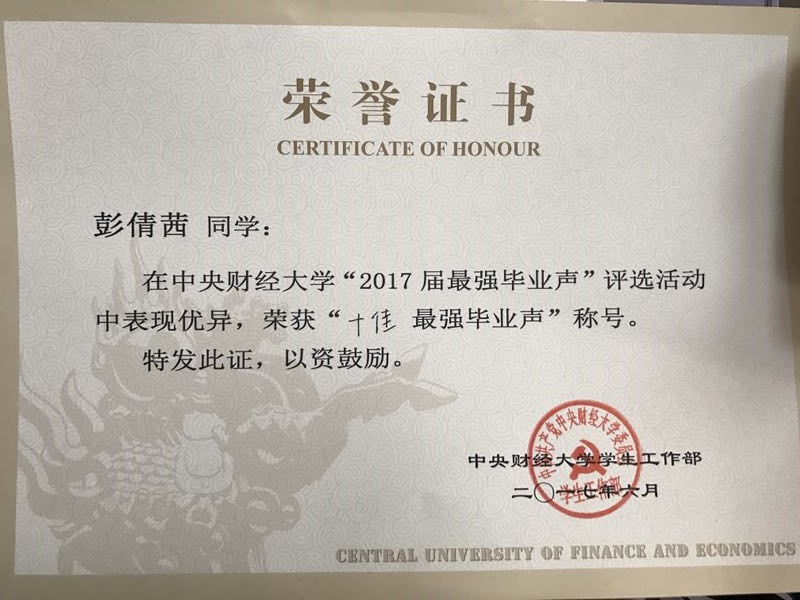 据悉,彭倩茜同学为少数民族员工,中共预备党员,曾获得北京市优秀毕业生、永利集团官网三好员工,连续四年荣获全面发展一等奖学金等。主持国家级老员工创新课题并获得国家级优秀结项,所发表论文入选教育部大创年会,公益创业项目获中国青少年发展基金会全国优秀项目奖。