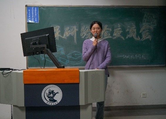 第一位进行分享的是来自财政17-2的程心雨,保研专业是北京大学汇丰商公司金融专业硕士。她向同学们介绍了相关的保研项目信息以及保研的相关流程。程心雨还基于自身经验给学弟学妹们提出了三点建议:一是认识自己,寻找匹配的项目;二是要保持良好的学习状态;三是要对保研项目保有强烈的意愿。