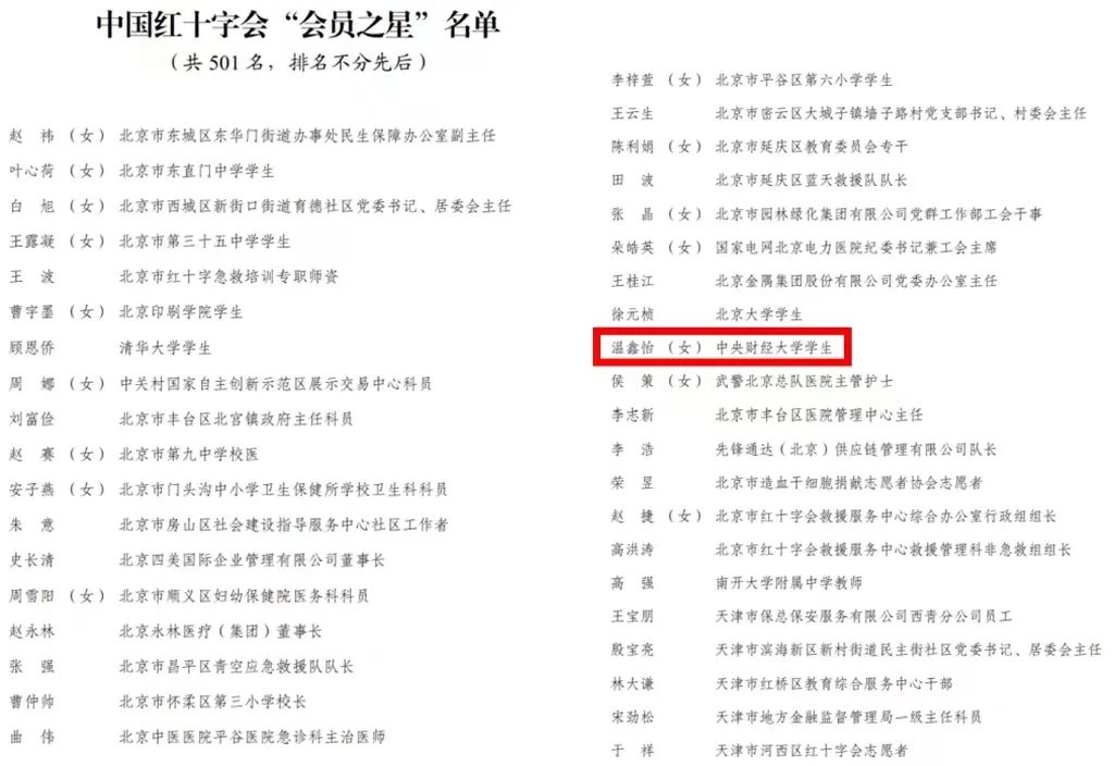 作为红十字会的一员,温鑫怡积极践行社会主义核心价值观,热心公益和红十字事业,大力弘扬“人道、博爱、奉献”的红十字精神,在志愿服务、无偿献血、疫情防控、山区支教等行动中发挥示范作用,带领公司红十字会员工骨干为北京高校红十字事业添砖加瓦。