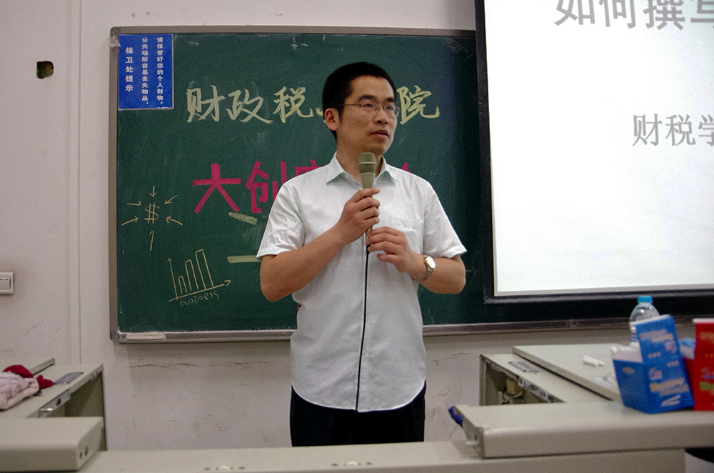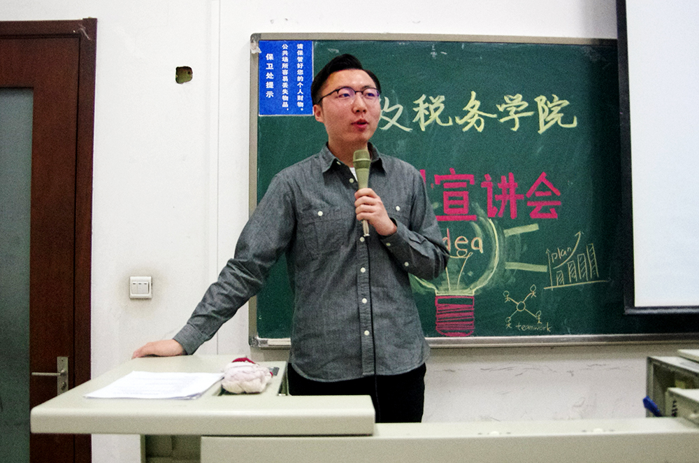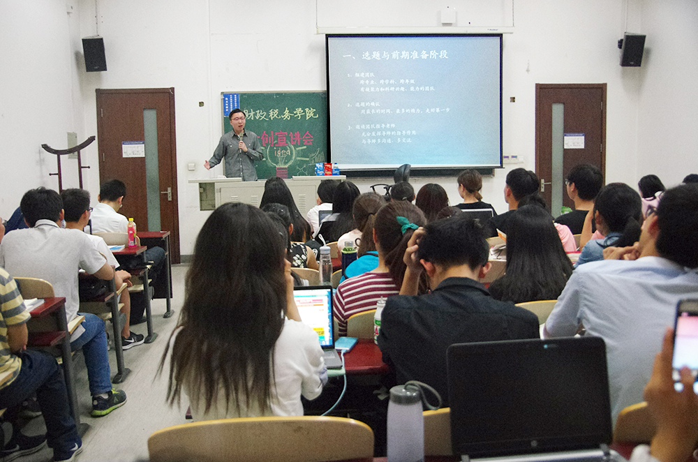 随后,国税14王鹏同学上台与大家进行经验分享,由王鹏同学担任主持人的创新项目于2016年获得国家级立项资格,关于大创的每一个环节,他都结合自己的经历贡献出宝贵的经验。在最初的选题与准备阶段,要选择志同道合,互相了解的队友,要保证整个团队有一定的凝聚力和科研能力。选题的确认是最应当投入时间和精力的环节,要选择感兴趣而且可操作的题目,同时还要充分发挥老师的指导作用。在之后的开题答辩阶段,小组内要分工明确细化,精准把握时间按进度落实工作。成员之间应当多沟通多交流,对申报书进行反复的雕琢,力求完美。在答辩过程中,应注重突出团队的创新之处。在立项之后,要持续推进研究的进程,不断更新完善选题。王鹏同学的介绍要点清晰,并在讲述的过程中穿插自己的经历,语言风趣幽默,引人入胜。他严谨刻苦的科研精神也极大地鼓舞了在场的同学。