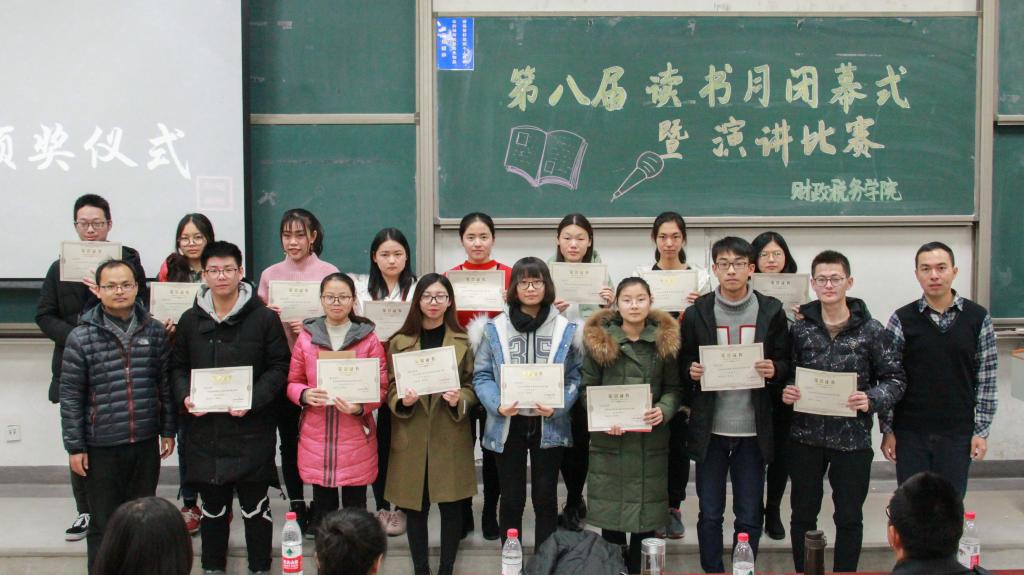 与此同时,演讲比赛的评分结果出炉,国税15的王舒柳同学获得一等奖,财政学类17-6班的瞿诗琦和刘天颀同学获得二等奖,财政15-2班的曹颖同学、财政学类17-2班任太荣同学、财政学类17-4班黄楚君同学获得三等奖,由党委副书记宋立岩老师为大家颁奖。紧接着,读书大赛优秀团队及个人、朗诵大赛、最美书评活动也依次进行了颁奖,葛岩老师,刘明老师,于来老师,寇恩惠老师,陈颖老师,徐燕妮老师依次上台为大家颁奖。