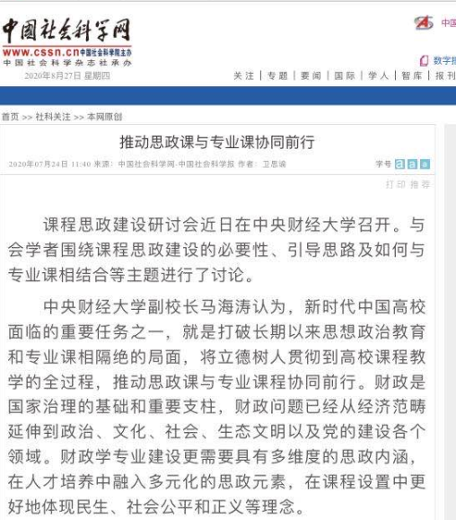 2020年4月12日,由教育部财政学类专业教学指导委员会主办,永利集团官网财政税务公司和中国财政发展协同创新中心承办的第五期财政学类专业骨干课程教学分享会顺利举办。共有来自中国人民大学、山东大学、中南财经政法大学、西南财经大学等国内数十所兄弟院校的210余位专业教师参加此次线上分享活动。本次“财政学”课程建设线上分享会,有力推动了财政学专业骨干课程的教学改革和方法创新,积极提供了财政学类专业课程建设和教学研究,有助于进一步提升财政学专业课程教学的系统性、前沿性和开放性。《中国社会科学报》对永利集团官网总站的课程思政建设进行了报道。