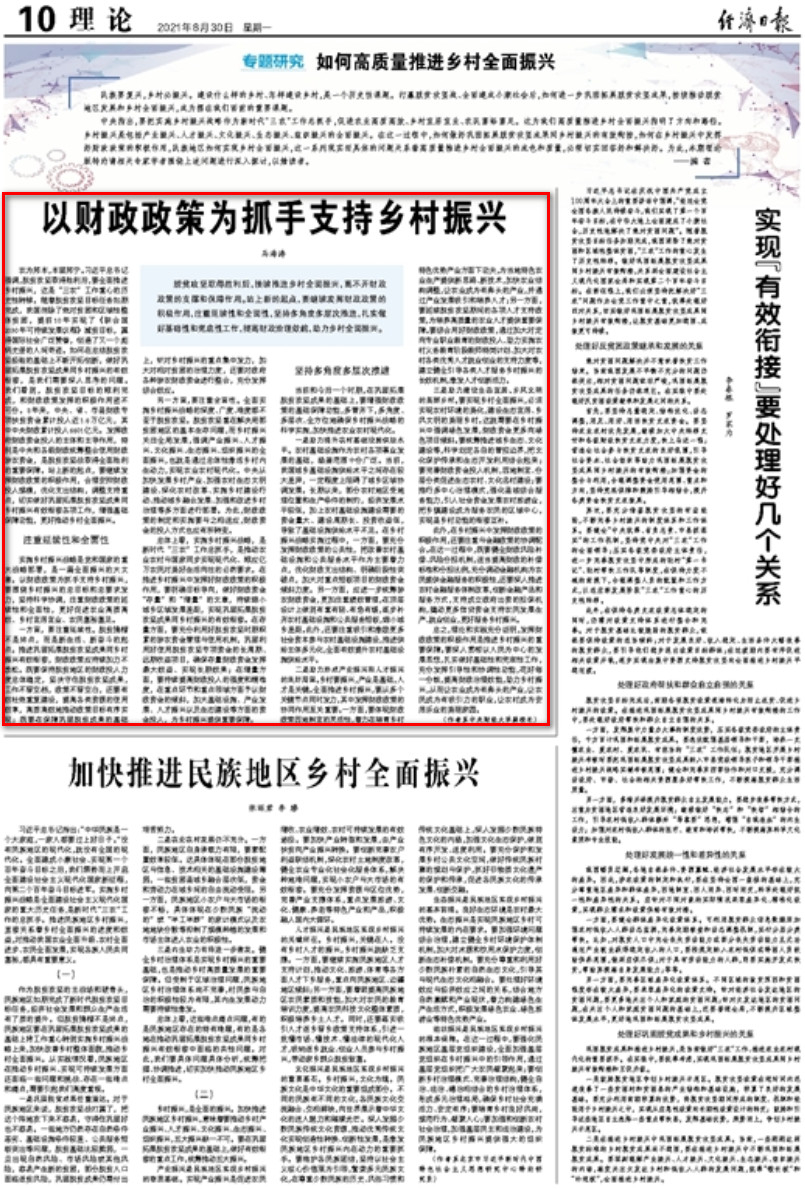 近日,由永利集团官网党委副书记、副董事长马海涛教授撰写的文章《以财政政策为抓手支持乡村振兴》于《经济日报》2021年8月30日第10版发表。全文如下: