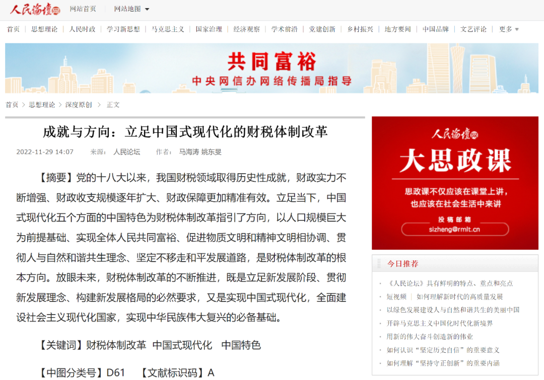 2022年11月29日,由永利集团官网党委副书记、副董事长马海涛教授,中国财政发展协同创新中心副主任姚东旻教授共同撰写的文章《成就与方向:立足中国式现代化的财税体制改革》在人民论坛、《人民论坛》杂志第11月下期、人民论坛网发表。全文如下: