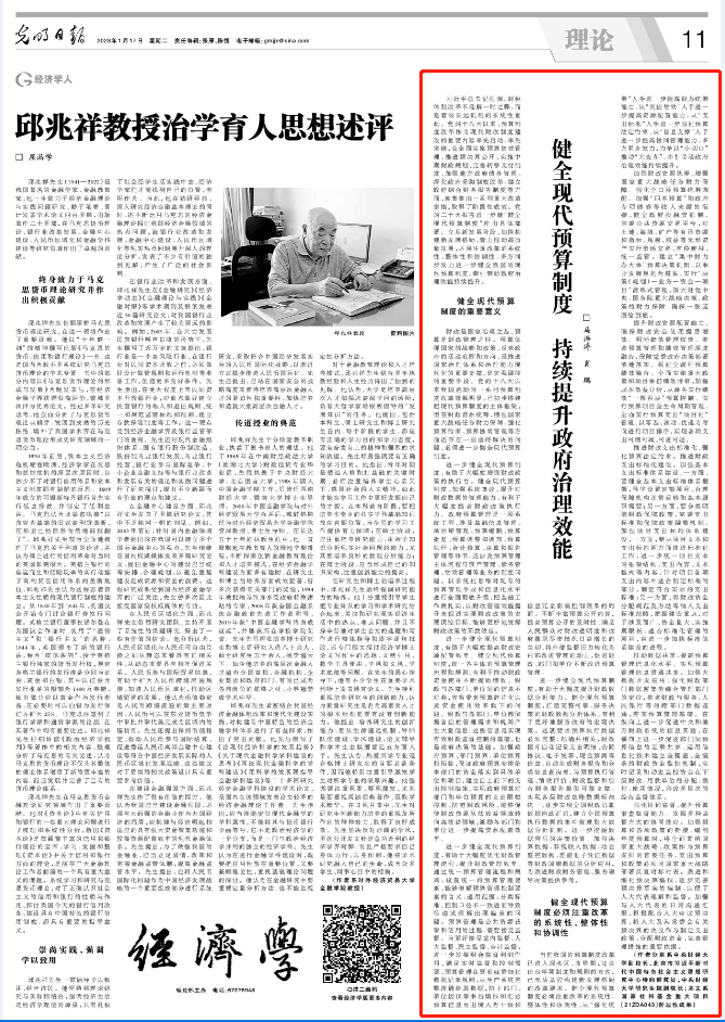 1月17日,《光明日报》(理论版)刊登了永利集团官网党委副书记、副董事长马海涛教授,公司党委书记肖鹏教授署名文章《健全现代预算制度 持续提升政府治理效能》。