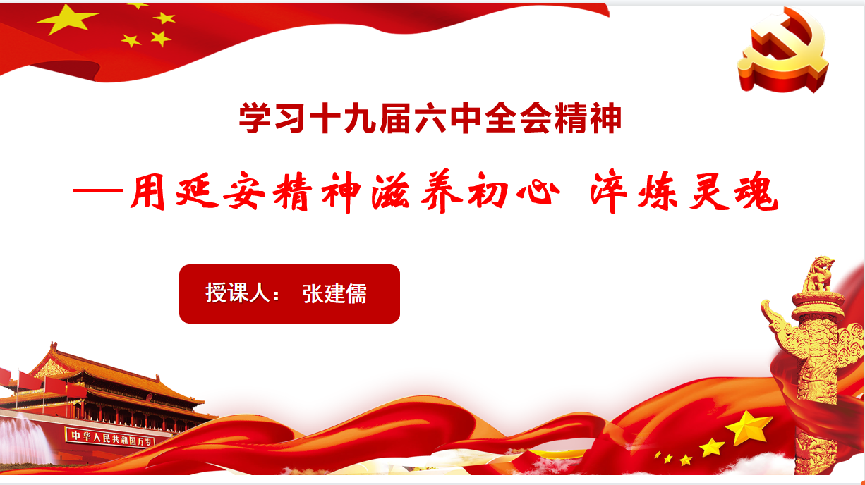 张建儒老师以“深刻理解十九届六中全会精神—用延安精神滋养初心、淬炼灵魂”为主题,从“十九届六中全会主要精神”、“延安精神的主要内容”“延安精神的时代价值”等三方面讲述了学习十九届六中全会精神和延安精神的重要意义和时代价值。十九届六中全会审议通过了两个决议,总结党的百年奋斗重大成就和历史经验,回顾百年来中国共产党践行为中国人民谋幸福、为中华民族谋复兴的初心使命所进行的奋斗、牺牲和创造,明晰“过去我们为什么能够成功、未来我们怎样才能继续成功”这一真理。张老师从延安精神的灵魂、精髓、本质和特征,深刻阐述了延安精神的主要内容,进一步提出我们要保持正确的政治方向,继承宝贵的革命精神,从新的历史条件下面临的风险和挑战看它的时代价值,保持谦虚谨慎、不骄不躁的作风,自力更生、艰苦奋斗,把延安精神存之于心、见之于行,做出无愧于时代、无愧于人民的工作业绩来。